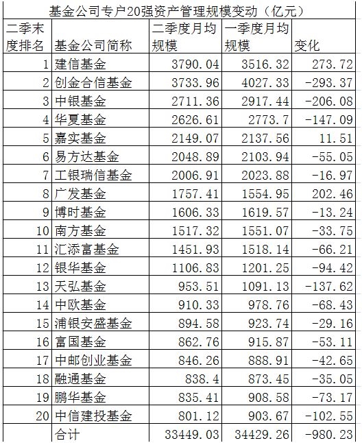 建信基金专户管理资产二季度月均规模重返首位