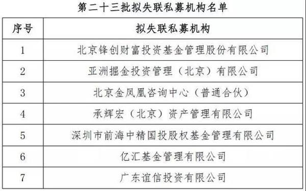 今天(8月8日)下午,中国证券投资基金业协会(以下简称“协会”)公布了第二十三批拟失联私募机构,共有7家机构被列入这一名单:
