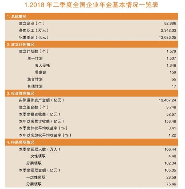 近日,人力资源社会保障部社会保险基金监管局发布了2018年2季度全国企业年金基金业务数据。从数据情况来看,数据统计显示,2018年二季度,共有82886家企业建立了企业年金,参与职工数达到2343万人,积累基金一共13686亿元,实际运作资产金额13467亿元。