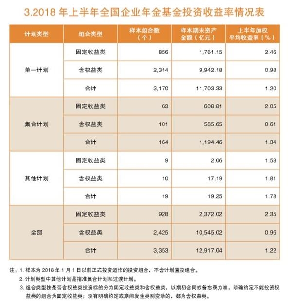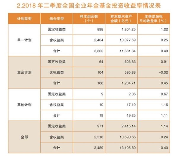 具体来看,今年2季度,年金基金在固定收益类投资方面平均收益率为1.14%,含权益类投资的平均收益率为0.24%。今年上半年,固定收益类投资方面的平均收益率为2.35%,含权益类投资的平均收益率为0.96%。报告解释,所谓含权益类投资的意思是,凡没有明确约定不能投资权益类市场的基金都为含权益类投资。
