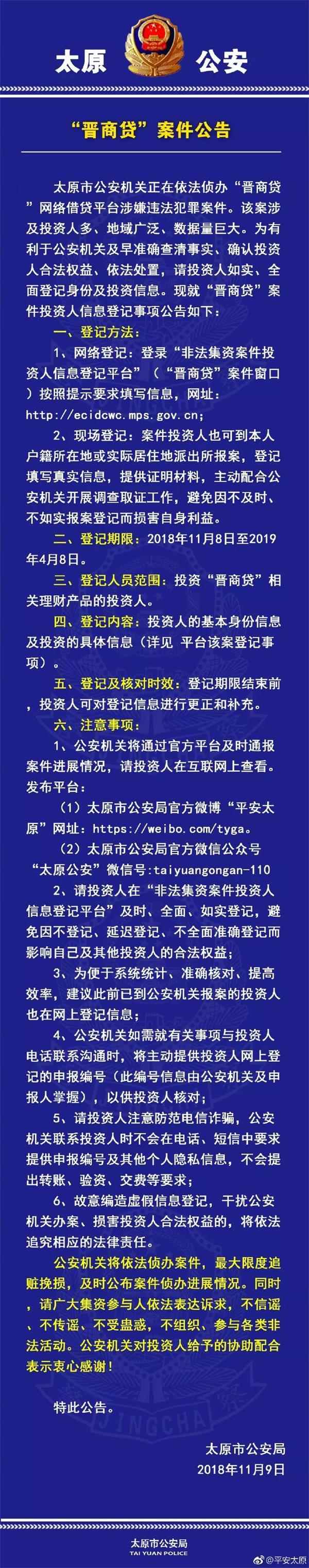 每天都有新的进展。11月9日,太原市公安机关表示,晋商贷涉嫌违法犯罪案涉及投资人多,地域广泛、数据量巨大,需要投资人如实、全面的登记身份和投资信息。