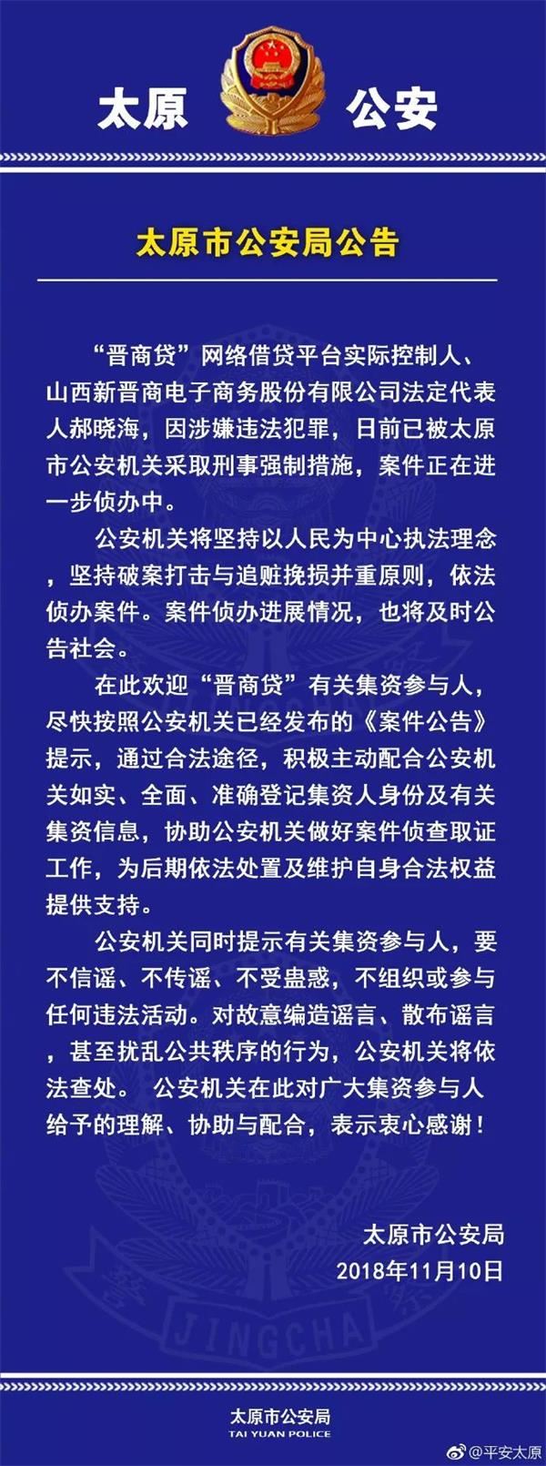在11月8日主动到公安局投案之后,11月10日,太原市公安局在其官方微博通报称,“晋商贷”网络借贷平台实际控制人、山西新晋商电子商务股份有限公司法定代表人郝晓海,因涉嫌违法犯罪,日前已被太原市公安机关采取刑事强制措施,案件正在进一步侦办中。