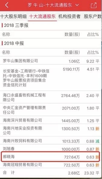 今年二季度,郝晓海进入上市公司罗牛山的十大流通股东榜,其出资727.64万元,持股比例为0.63%,合计6300多万市值。不过,从今年三季报可以看出,郝晓海已经不在前十大股东之列。