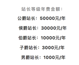 根据介绍,同城约单推广站长分为五个级别:公爵、侯爵、伯爵、子爵、男爵。普通成为同城约单的推广站长,需购买相应身份,方可获得站长权益。来看看这五个级别的收费: