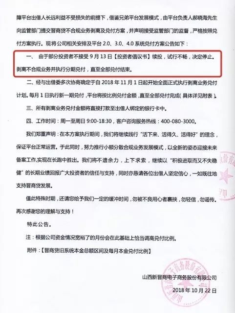 10月22日,晋商贷又发布了关于剥离不合规业务及旧系统兑付方案公告,公告里表示,由于部分投资者不接受9月13日[投资者倡议书]续投,试行不畅,决定停止。并决定自2018年11月1日起开始全面正式执行剥离业务兑付计划。每月1日执行新一期兑付,平台将按比例兑付金额,直至全部兑付完成。