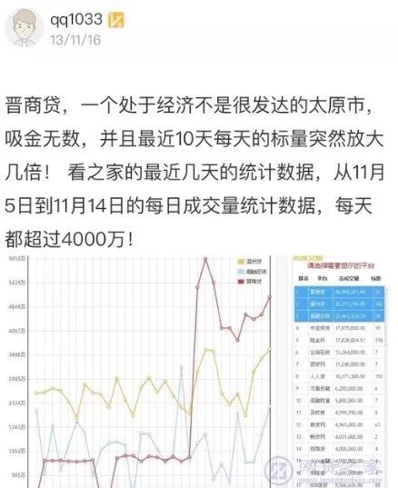 在出事之前,晋商贷号称山西第一网贷平台,吸金能力自然不在话下。最疯狂的是在2016年,根据网贷之家当时的统计,其从11月5日-14日,每日成交量都超过4000万元,10天吸金超过5亿元。以11月14日为例,当日其成交量为4896.8万元,是网贷行业的巨头陆金所的2倍多,当日陆金所仅有1783.9万元的成交量。