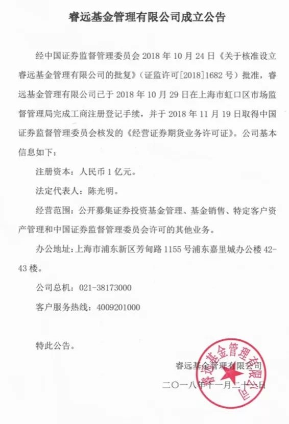 今天,睿远基金发布公告显示,睿远基金管理有限公司已于2018年10月29日在上海市虹口区市场监督管理局完成工商注册登记手续,并于2018年11月19日取得中国证券监督管理委员会核发的《经营证券期货业务许可证》。