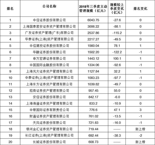 今日晚间,中国基金业协会公布了今年三季度券商资管月均规模前20名和主动管理资产规模前20名的榜单。从数据来看,前20家券商资管月均总规模达8.9万亿元,其中有18家规模出现不同程度的下滑,最高下滑超2000亿元。作为券商转型的主要出路,主动管理能力至关重要。数据显示,前20家券商主动管理资产月均规模合计为2.98万亿,其中有5家规模较上季度出现上升,最高增加超100亿元。