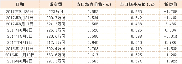 记者捋了一下2016年8月以来,在快速下跌过程中,出现单日200万份成交量当日的折溢价情况,仅供参考: