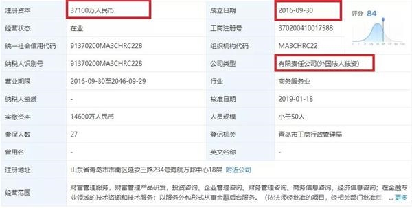 天眼查信息显示,青岛意才财富管理有限公司成立于2016年9月30号,法定代表人是Giamberto Giraldo,注册资本3.71亿元,属于外商独资企业,意大利联合圣保罗银行股份有限公司全资控股。经营范围包括财富管理服务,财富管理产品研发,投资咨询、企业管理咨询、财务管理咨询、商务信息咨询、经济信息咨询;在金融专业领域的技术咨询和技术服务;以服务外包形式从事金融后台服务。