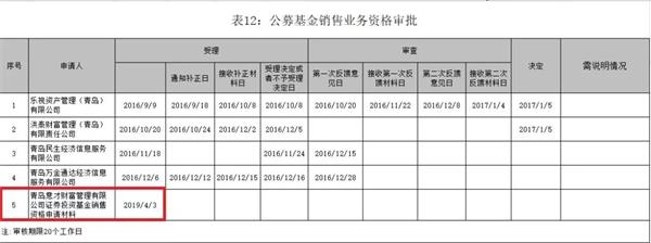 青岛证监局更新的《证券期货基金机构行政许可申请受理及审核情况公示表》显示,青岛意才财富管理有限公司递交了公募基金销售资格申请,相关材料已在2019年4月3日接收。