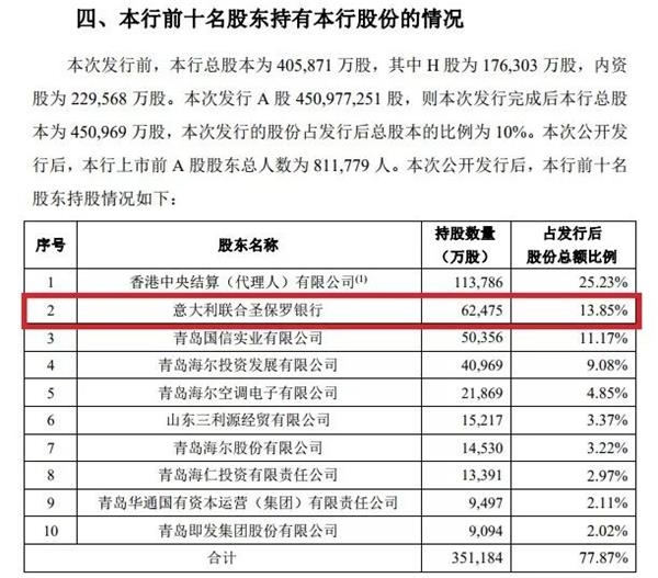 今年年初上市的青岛银行股东名单中也出现意大利联合圣保罗银行的身影,青岛银行IPO招募说明书显示,意大利联合圣保罗银行参股13.85%,是其第二大股东。