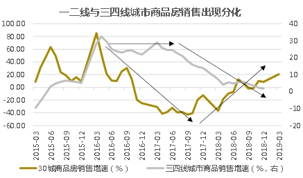 历史上,一二线城市与三四线城市的商品房销售走势基本一致,但在新一轮周期中已出现了分化。随着棚改目标减少,棚改政策收紧,2019年一季度,三四线销售由于棚改需求透支而继续走弱。