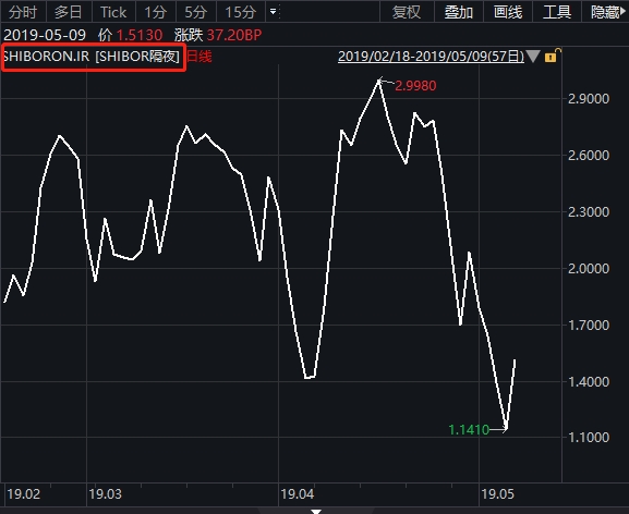 截至记者发稿时的5月9日上午收盘,Shibor隔夜、DR001(隔夜)利率分别回升至1.51%、1.9%,分别较昨日上行37.2BP、50BP,已经收复昨日跌幅。