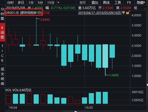 作为银行间存款类机构质押式回购利率也开始大降。截至5月8日收盘,DR001(隔夜)报1.40%,相比上一交易日下降50个BP,盘间最低达到1.04%。