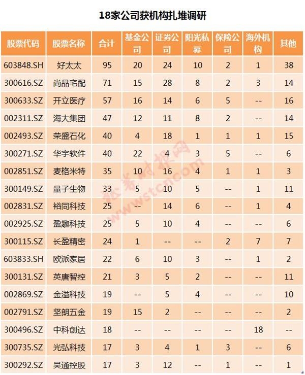 数据显示,个股方面,好太太累计接待机构达95家,位居首位;尚品宅配累计接待71家机构,排名第二,开立医疗累计接待57家机构,排名第三。另外,海大集团、荣盛石化、华宇软件等公司接待机构的数量也较多。