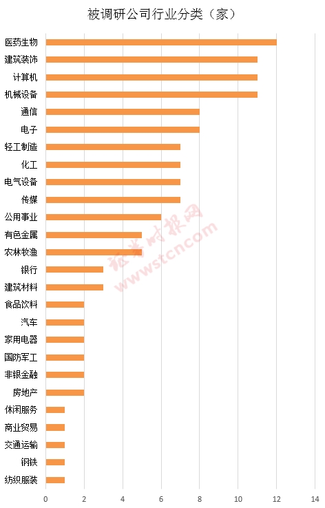按行业分类看,上周被调研公司中,属于医药生物行业的数量最多,达12家。另外,建筑装饰、计算机、机械设备等行业涉及的公司数量也较多,均有11家。