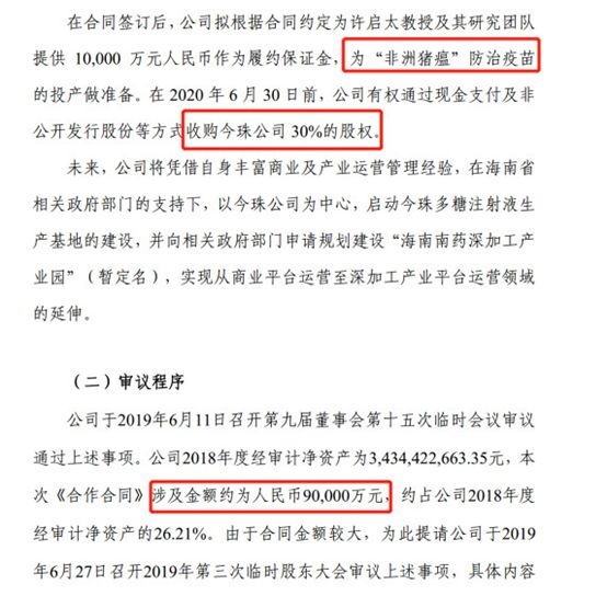 海印股份表示,海印股份拟与许启太、今珠公司签署《合作合同》,为许启太及其研究团队提供1亿元人民币作为履约保证金,为“非洲猪瘟”防治疫苗的投产做准备。
