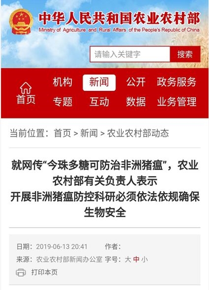 13日晚间8时左右,中国农业农村部新闻办公室表示已经关注到网络传播所谓“今珠多糖可以防治非洲猪瘟”的事情。