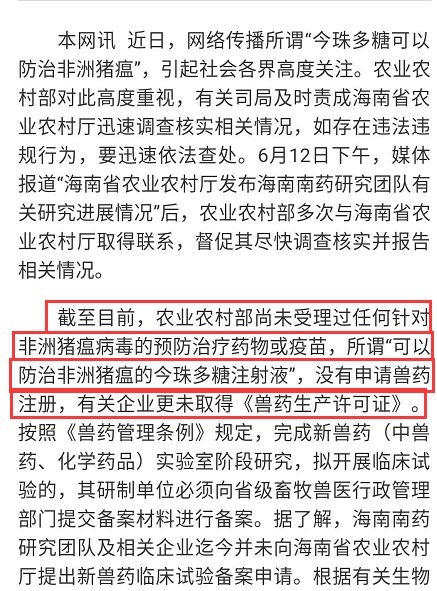 截至目前,农业农村部尚未受理过任何针对非洲猪瘟病毒的预防治疗药物或疫苗。所谓可以防治非洲猪瘟的今珠多糖注射液,没有申请兽药注册,有关企业更未取得《兽药生产许可证》。而据其了解,海南南药研究团队及相关企业迄今并未向海南省农业农村厅提出新兽药临床试验备案申请。