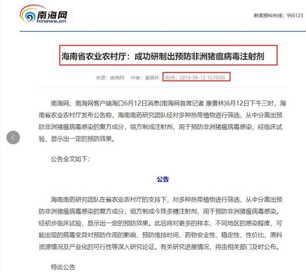12日晚间,人民网海南频道却报道,当天下午,海南省农业农村厅相关负责人表示,该厅并未发布所谓“成功研制出预防非洲猪瘟病毒注射剂”的公告,相关媒体在标题制作中不准确导致公众产生误解。