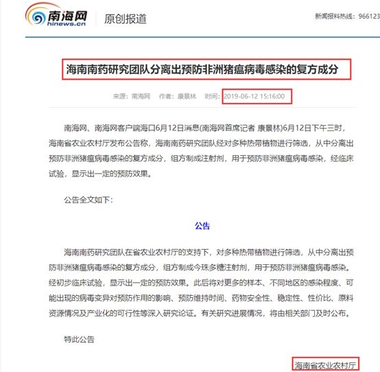 巧合的是,就在海印股份发布公告的第二天(12日)下午3点,海南媒体南海网发布消息称,“海南省农业农村厅发布公告称,海南成功研制出预防非洲猪瘟病毒注射剂”。并贴出了公告全文。
