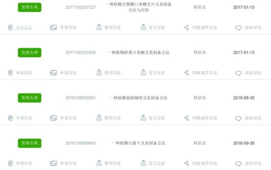 但基金君查询了国家知识产权局专利检索,却并没有发现“今珠多糖注射液”的相关专利。而从已有的专利列表中看到,许启太本人的多项专利,更多与“槟榔”有关。