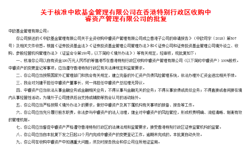 公告显示,中欧基金以自有资金190万元人民币的等值港币在香港特别行政区收购中睿资产100%股权,其中刘建平担任中睿资产董事长、何一伟担任中睿资产总经理。批复要求中欧基金应当按照国家外汇管理部门和我会有关规定,建立完备的外汇资产负债风险管理系统,依法办理外汇资金进出相关手续。