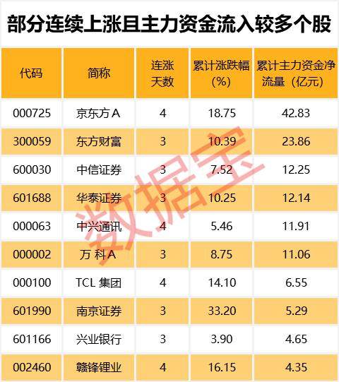 值得注意的是,2226只连续上涨个股中,85只个股期间主力资金累计净流入超过亿元。其中,累计资金流入最多的为京东方A,主力资金累计流入42.83亿元。