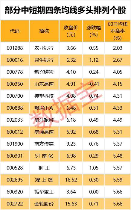 最新数据显示,两市有228只个股5日、10日、20日、60日四条均线近日呈多头排列。其中农业银行、民生银行、新兴铸管股价与60日均线的乖离率最小,分别为2.03%、2.67%、4.05%。