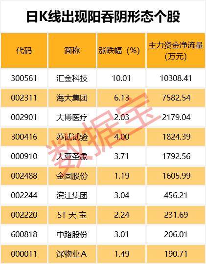 截至12月17日收盘,两市共有15只个股日K线出现阳吞阴形态,当天涨幅最大的是汇金科技、海大集团、健友股份,涨幅分别为10.01%、6.13%、4.36%。