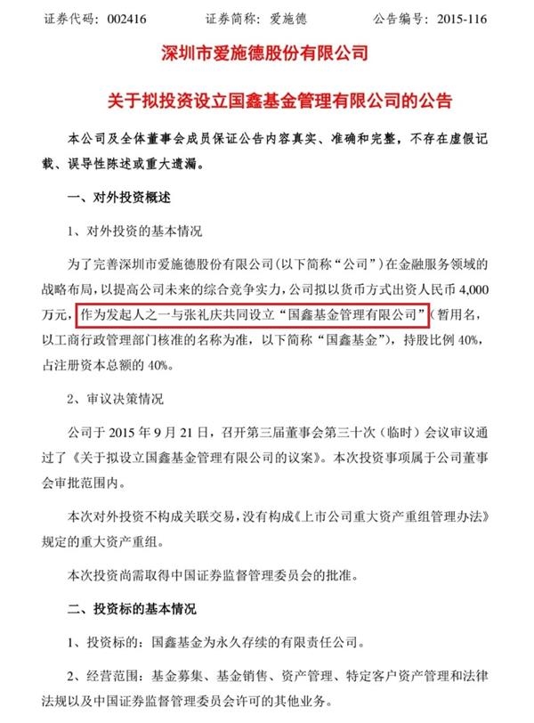2015年9月21日,爱施德曾对外发布了“关于拟投资设立国鑫基金管理有限公司的公告”。其中,爱施德出资人民币4000万元,占注册资本总额的40%,而剩余股份均由张礼庆个人出资人民币6000万元拥有。