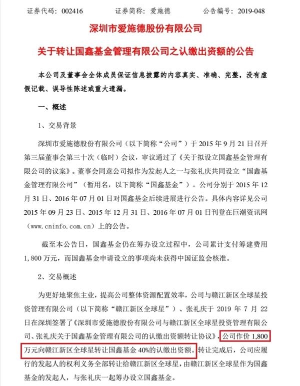 去年7月24日,爱施德发布《关于转让国鑫基金管理有限公司之认缴出资额的公告》,公告中提到,为更好地聚焦主业,提高公司整体资源配置效率,公司与赣江新区全球星投资管理有限公司、张礼庆于2019年7月22日在深圳签署了关于国鑫基金管理有限公司的认缴出资额转让协议》,公司作价1,800万元向赣江新区全球星转让国鑫基金40%的认缴出资额。截至公告日,爱施德已累计支付国鑫基金筹建费用1,800万元,
