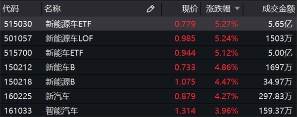 受多地政府出台刺激经济的利好政策推动,汽车板块从开盘起就一直领涨大A,其中新能源车这个细分板块表现不俗。场内基金中,新能源车ETF、新能源车基金(501057.SH)、新汽车基金(160225.SZ)等涨幅均在4%以上。