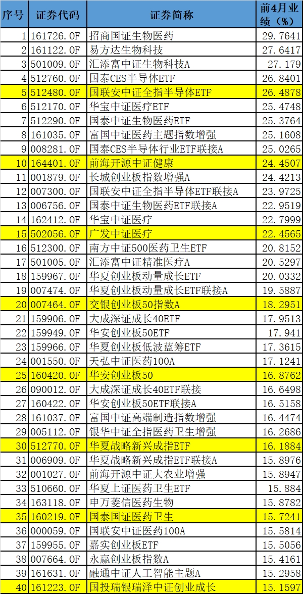 前4月表现较好的指数型基金一览(剔除C类)