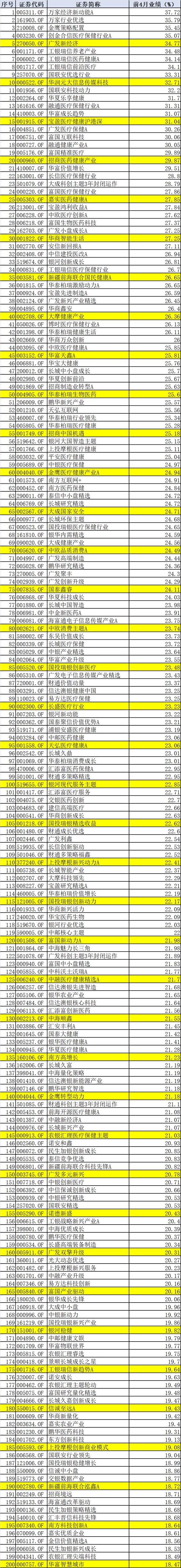 此外,创金合信医疗保健行业、广发新经济、工银瑞信养老产业、工银瑞信医药健康、工银瑞信前沿医疗、国联安优选行业、华润元大信息传媒科技、国联安科技动力、华夏乐享健康、融通医疗保健行业、华富成长趋势、宝盈医疗健康沪港深、广发医疗保健、富国互联科技、融通健康产业A等,收益率也超过30%。显然,今年表现靠前的基本都是医药和科技主题基金。