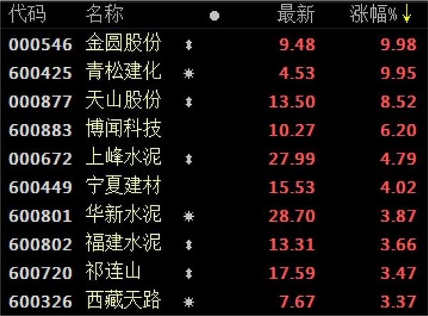 在海螺水泥的等带动下,水泥板块今日早盘大幅领涨。申万水泥制造行业整体涨幅达到3.12%,青松建化、金圆股份收获涨停,上峰水泥、宁夏建材等涨幅超过4%。