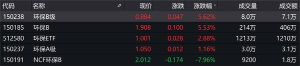 除此之外,环保板块同样涨幅在前,申万公用事业行业涨幅为1.67%,科融环境(300152.SZ)、中创环保(300056.SZ)涨停。场内环保主题基金涨跌互现,其中,环保B级(150238.SZ)、环保B(150185.SZ)涨幅均超过5%。