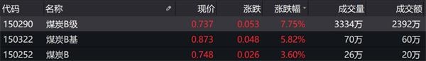 除此之外,煤炭板块走强,兖州煤业(600188.SH;01171.HK)涨幅超过8%,陕西煤业(601225.SH)涨幅超过7%。场内煤炭主题基金同样收红,其中,煤炭B级(150290.SZ)涨幅为7.75%,煤炭B基(150322.SZ)涨幅为5.82%。