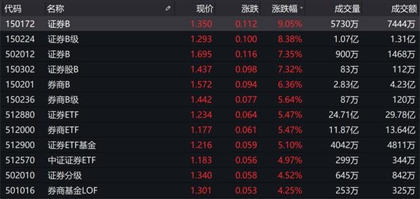 大金融板块午后发力,成为指数上涨的重要推动力量,券商板块中,国联证券(601456.SH)、浙商证券(601878.SH)等多只个股涨停。申万非银金融涨幅为5.27%,在申万一级行业中位居第一位。场内券商主题基金同样表现不俗,其中,证券B(150172.SZ)涨幅超过9%,证券B级(150224.SZ)涨幅超过8%。