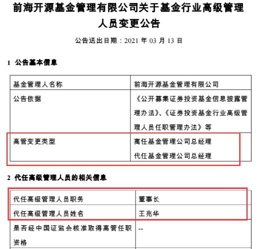 3月12日晚间,前海开源基金发布高级管理人员变更公告称,总经理贾红波因个人发展原因离任,由董事长王兆华代任总经理一职,任职日期为2021年3月11日。