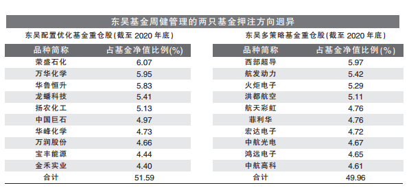 如果说基金经理管理的多只基金均押注同一板块,尚可以解释为基金经理的能力圈在同一板块,那么同一人管理的不同基金分别押注不同板块,则令人迷惑。东吴基金的周健即是如此,他管理的2只基金分别押注了不同行业。根据基金定期报告,他管理的东吴多策略基金,截至去年底规模不足3300万元。周健自去年12月16日才接手该基金,短短十来天,就把前任的持仓全部换成了军工股。他管理的另一只基金东吴配置优化基金,则是满仓化工股。该基金规模更为迷你,截至去年底尚不足1600万元。