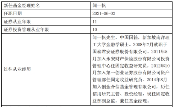闫一帆2008年7月就职于国泰君安证券股份有限公司。2011年5月加入永安财产保险股份有限公司投资管理中心任固定收益研究员,2012年10月加入第一创业证券股份有限公司资产管理部任固定收益研究员。2014年8月加入创金合信基金管理有限公司,历任信用研究主管、投资经理,现任固定收益部副总监,兼任基金经理。