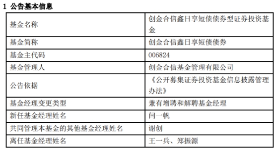 (原标题:创金合信鑫日享短债增聘闫一帆 王一兵与郑振源离任)