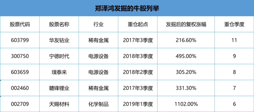 比如,2019年三季度,郑泽鸿就做出了大比例的调仓,把仓位都调到新能源车产业链,到2019年四季报时,华夏能源革新的十大权重就基本都是新能源车股票了。