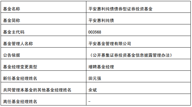 (原标题:平安合瑞定开债、平安惠利纯债增聘田元强为基金经理)
