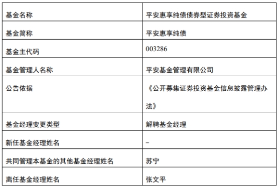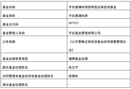 (原标题:平安基金张文平离任平安惠享纯债 新任两债基基金经理)
