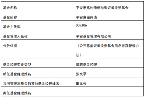 今日,平安基金管理有限公司发布基金经理变更公告,旗下平安惠铭纯债(009306)、平安惠澜纯债(A类007935、C类007936)增聘基金经理张文平,同时,张文平离任平安惠享纯债(A类003286、C类009404)。