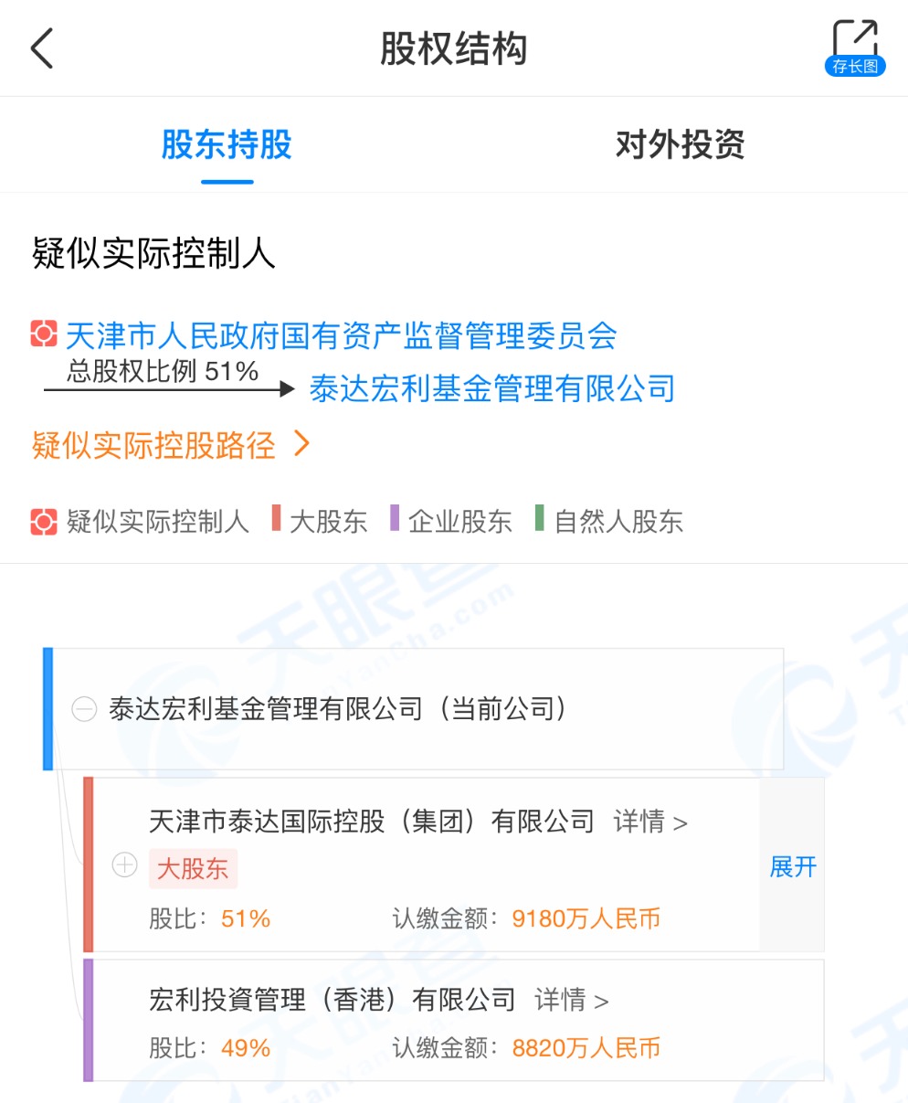 天眼查显示,泰达国际持有泰达宏利基金51%的股份,宏利投资管理(香港)有限公司(简称“宏利投资”)对泰达宏利基金的持股比例为49%。