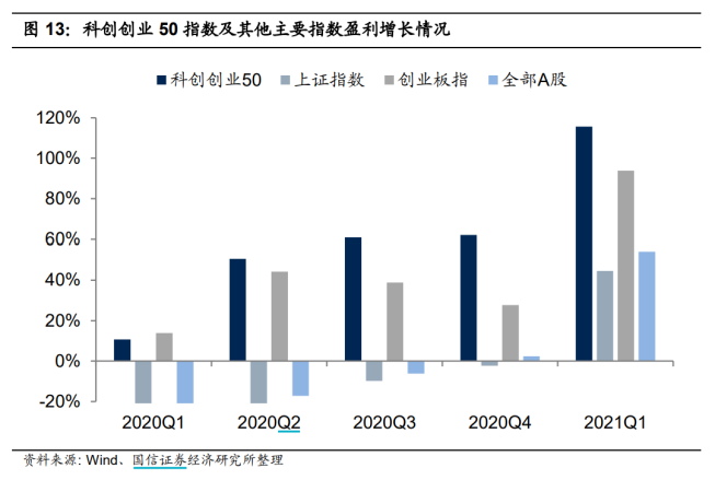 在2020年科创创业50指数归母净利润增速为47%,胜于科创50指数25%与创业板指18%,且远好于沪深300指数的0.2%。